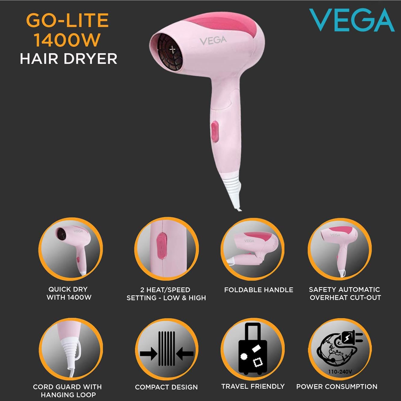 VEGA Go Lite 1400 Foldable Hair Dryer For Women With 1400 Watts Quick Dry, Automatic Cut-Out, 2 Heat & Speed Setting (Low & High), Travel Friendly, Mini Hair Dryer, (Vhdh-19), Pink