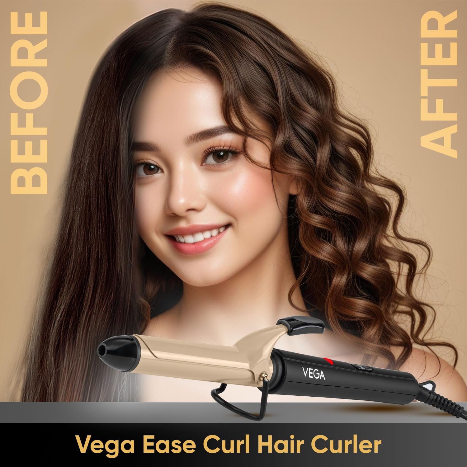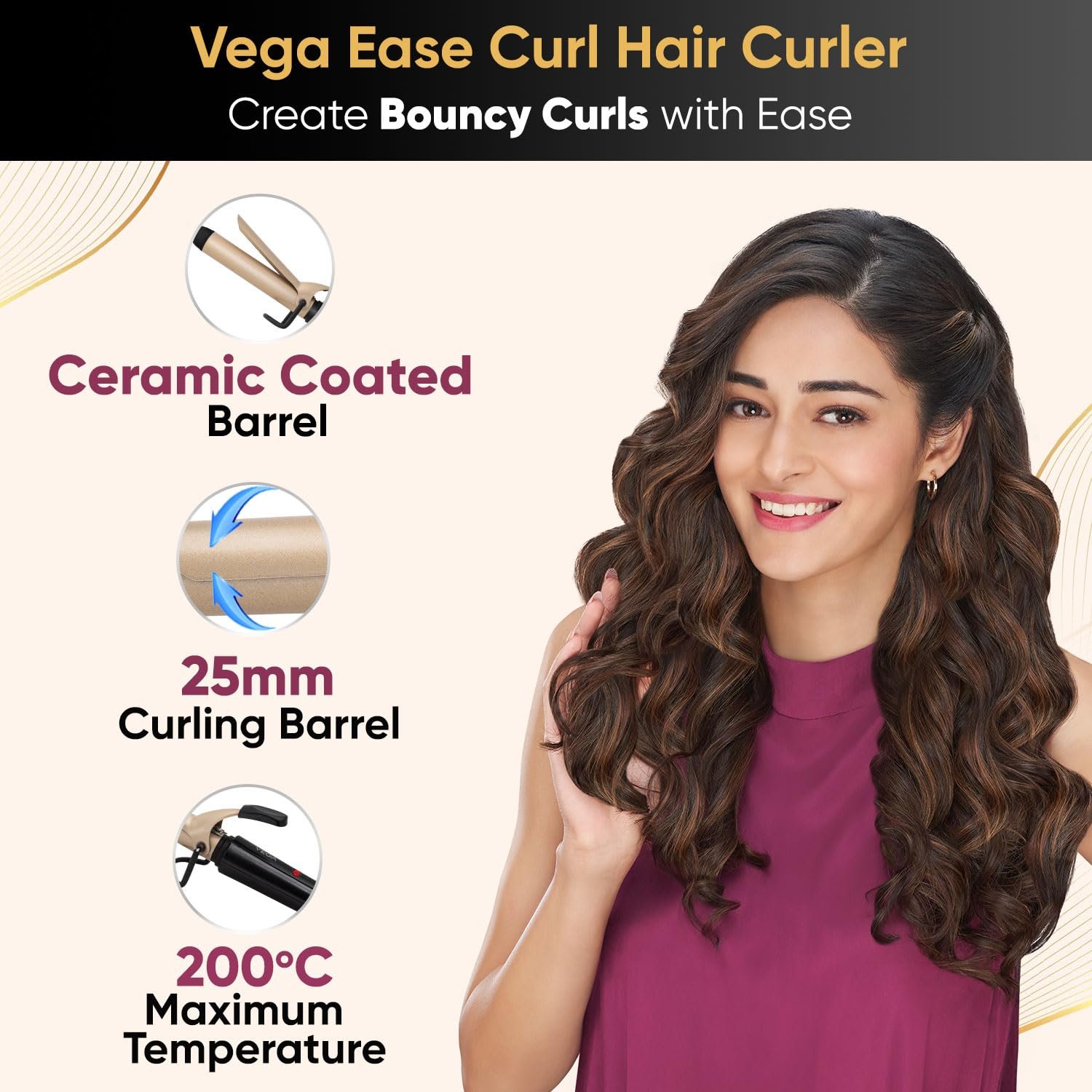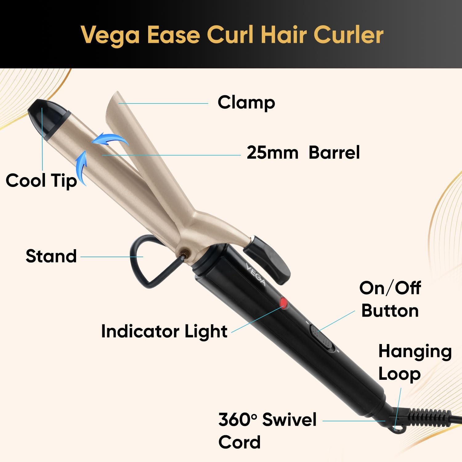 Vega Ease Curl 25 mm Barrel Hair Curler for Women with Ceramic Coated Plates, Safety Stand, Cool Tip, Fast Heatup, Hair Curling, Hair Styling for Women, (VHCH-02)