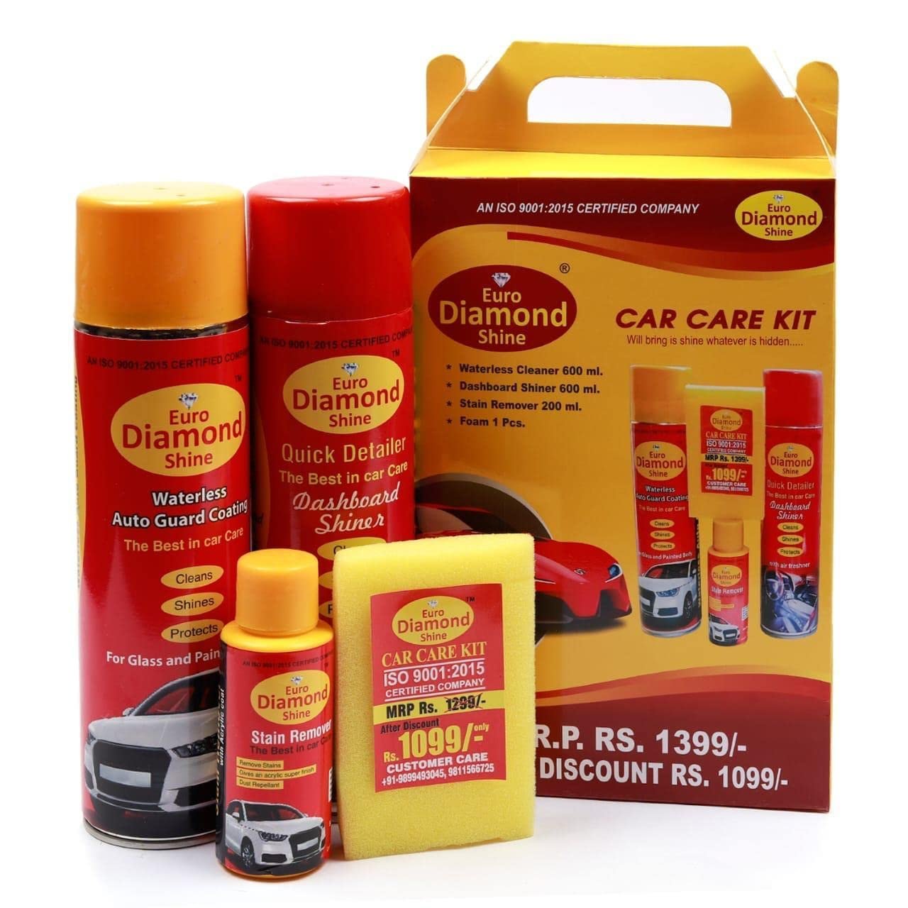 Euro Diamond Shine Large Kit- Car Dashboard Shiner+ Waterless Drywas Car Cleaner & Polish+ Stain Remover+ Sponge- Set of 4 Items