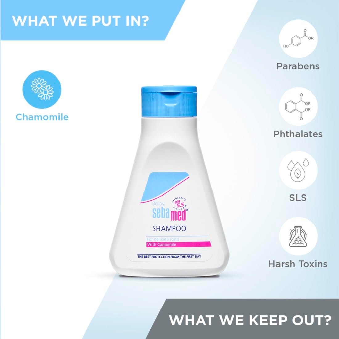 Sebamed children's shampoo has ph of 5. 5 And has sugar based mild cleanser. Other children shampoos have ph greater 7 and chemicals like formaldehyde, phthalates, sls which leads to allergic reactions. At ph 5. 5 Alone the scalp barrier remains intact. It has been clinically proven that only at ph 5. 5, Scalp is hydrated and strengthens scalp for optimal hair growth. Lipid and moisture loss is minimum and the growth of malassezia which leads to dandruff is restricted. Sebamed children's shampoo is free from irritants and hence has 0 percent incidences of irritant reactions. Sebamed children's shampoo contains botanical ingredient, hence the reported incidence of allergic reaction is 0. 000003 Percent. Only at ph5. 5 The baby's delicate eyes are not irritated and the tear free formula is free from formaldehyde. Sebamed children's shampoo is ideal for cradle cap, seborrheic dermatitis and dandruff. Made in germany100 percent soap and alkali free especially mild cleansers for gentle cleansing without irritating the scalp or hair herbal extract of chamomile alleviates irritation and soothes the skin special “no tears” formula does not sting in the eyes leaves hair fragrant and silky pleasant botanical fragrance ideal from six month onwards clinically proven suitability for cleansing of hair and scalp in babies and infants with sensitive scalp was proven in the dermatological study. Users documented an excellent acceptance of the shampoo and 93 percent were willing to continue using it.